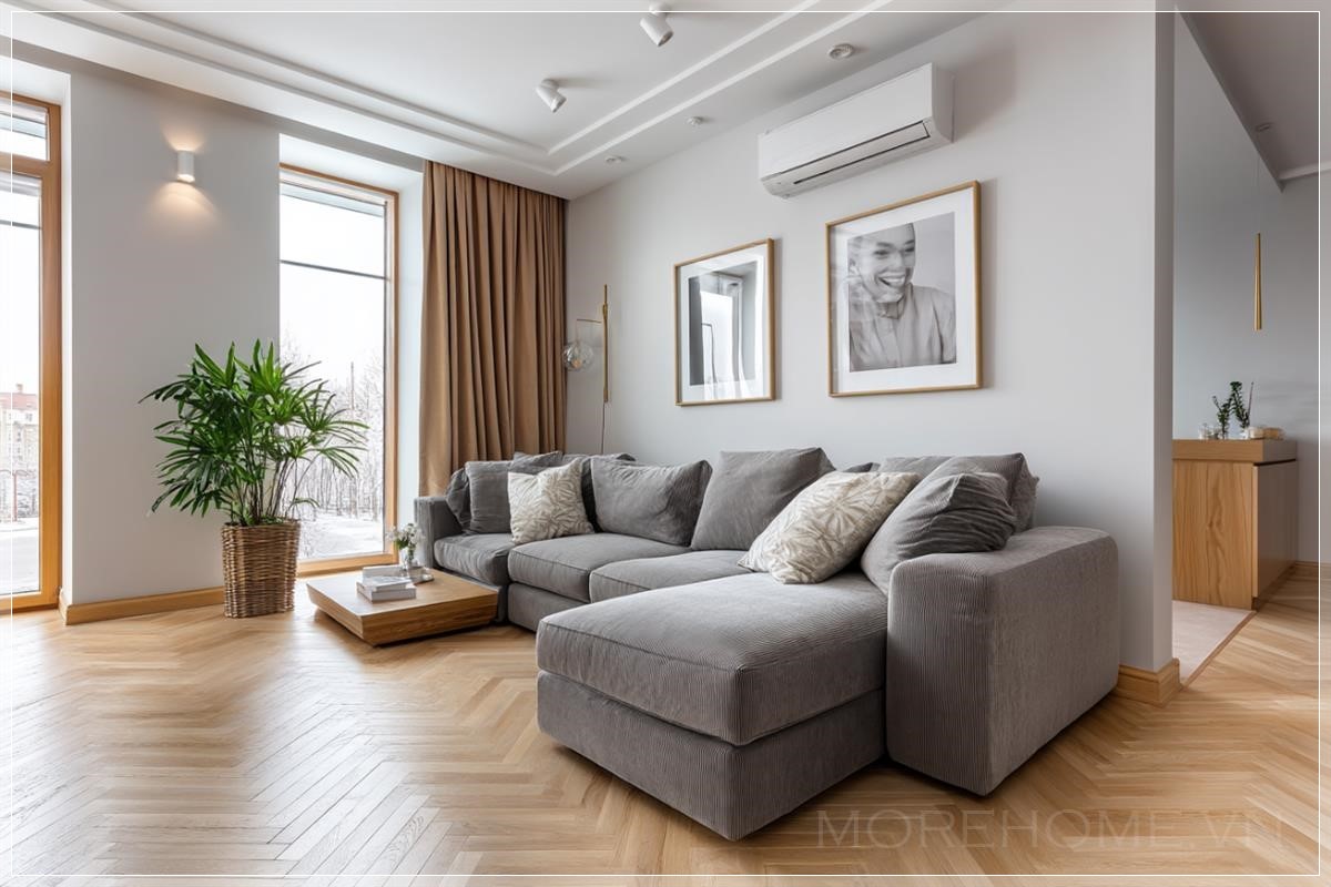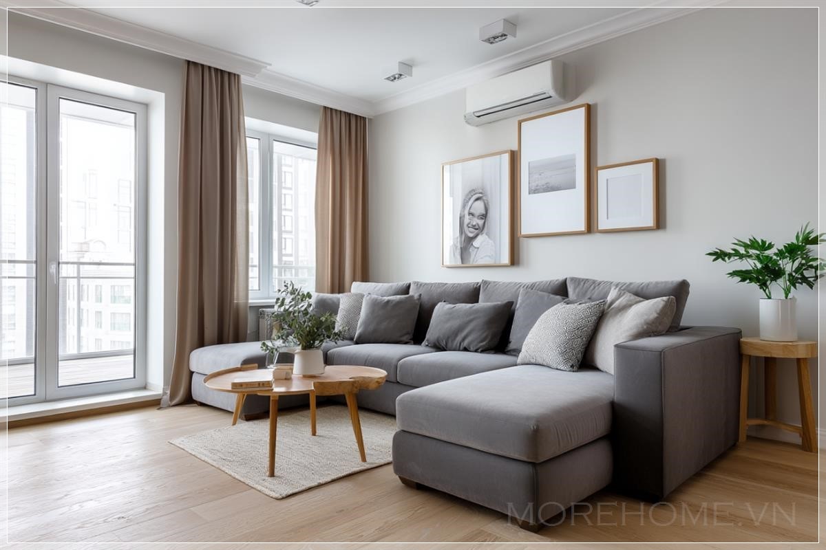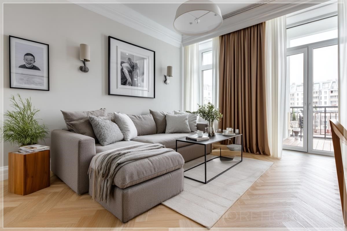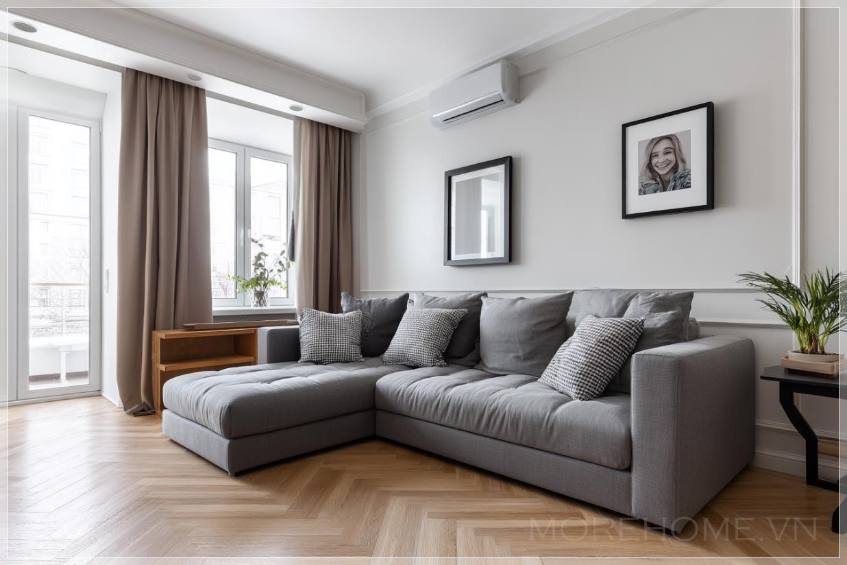 Ảnh chụp một chiếc sofa góc màu xám trong căn hộ có tường trắng và sàn gỗ, dành cho trang web bất động sản khu vực Nga. Sofa xám đặt trên sàn gỗ sáng, chụp từ cửa ra vào của phòng khách nhỏ có sàn gỗ parquet. Cửa sổ nằm bên cạnh, với rèm cửa màu nâu. Trần nhà cao, phía trên sofa là một khung tranh lớn treo. Mỗi bức tường có hai khung tranh, một bức để trống và một bức treo một bức ảnh vuông của một người đang cười. Góc chụp từ một góc nhìn.
