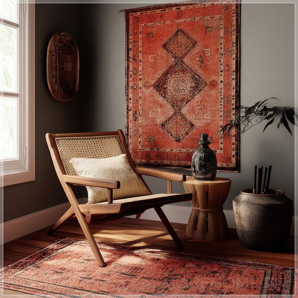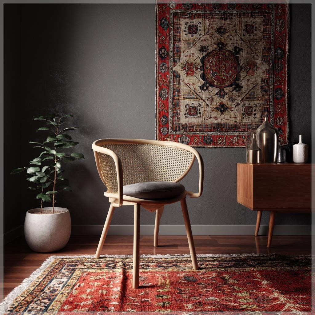Chiếc ghế gỗ đục lỗ thực tế đứng ở góc phòng, và một tấm thảm kiểu Soviet treo trên tường, phong cách West Elm. Liên hệ: https://zalo.me/morehomevietnam