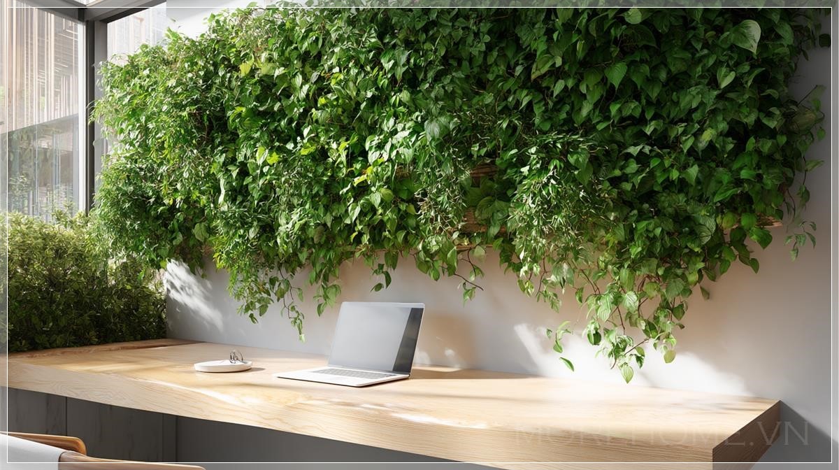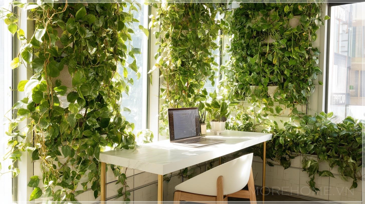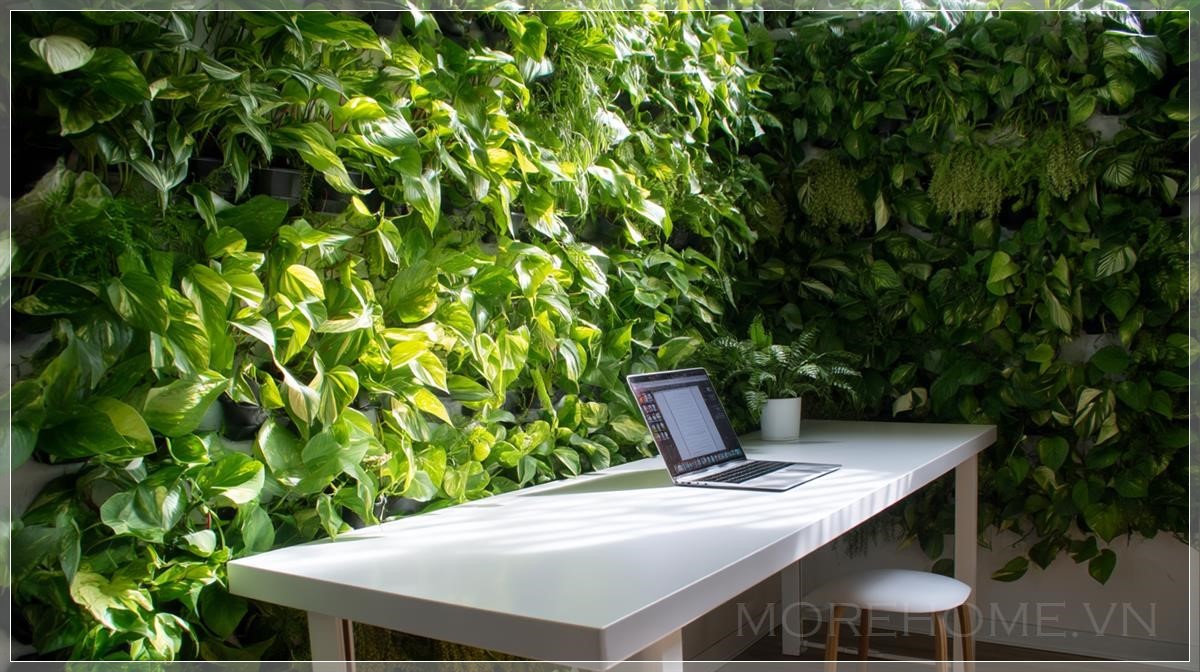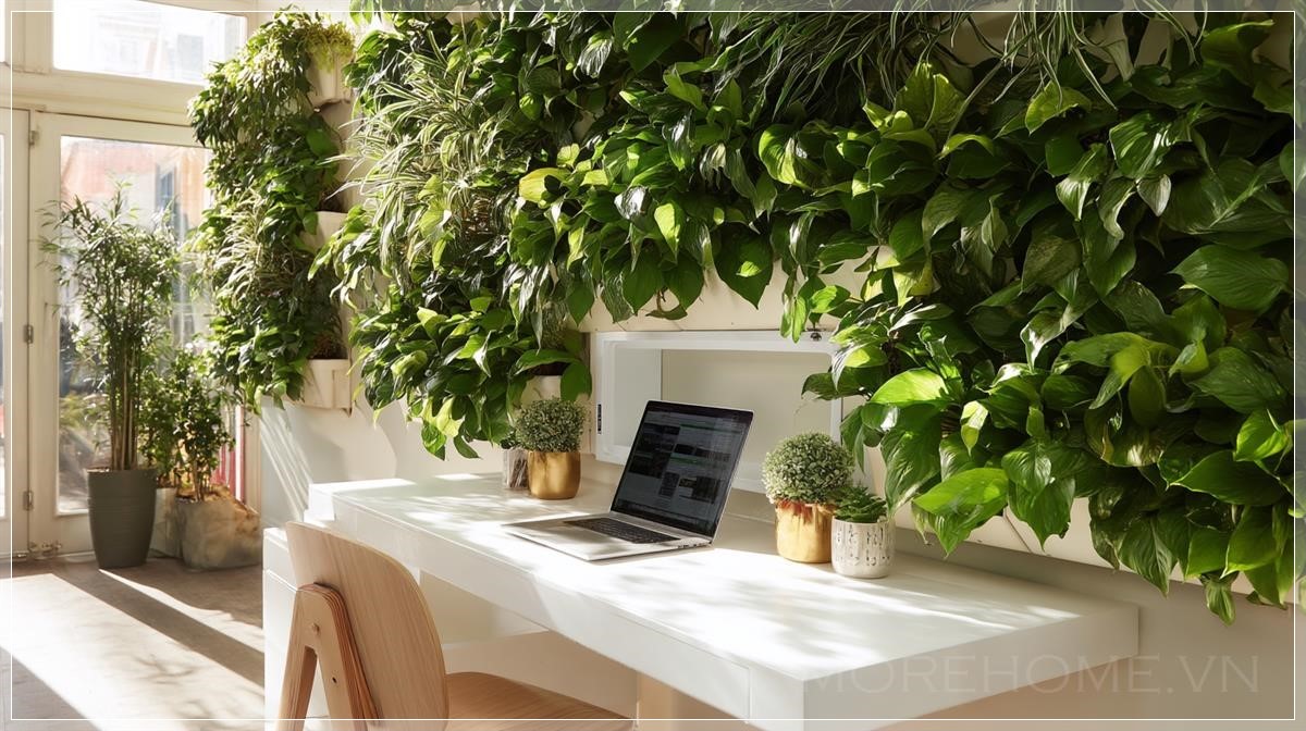 Không gian làm việc sáng tạo với cây xanh treo tường tươi tốt, bàn làm việc trắng gọn gàng với laptop đóng, cảm giác sống động nhưng dễ chịu, ánh sáng nhẹ nhàng chiếu vào. Liên hệ: https://zalo.me/morehomevietnam