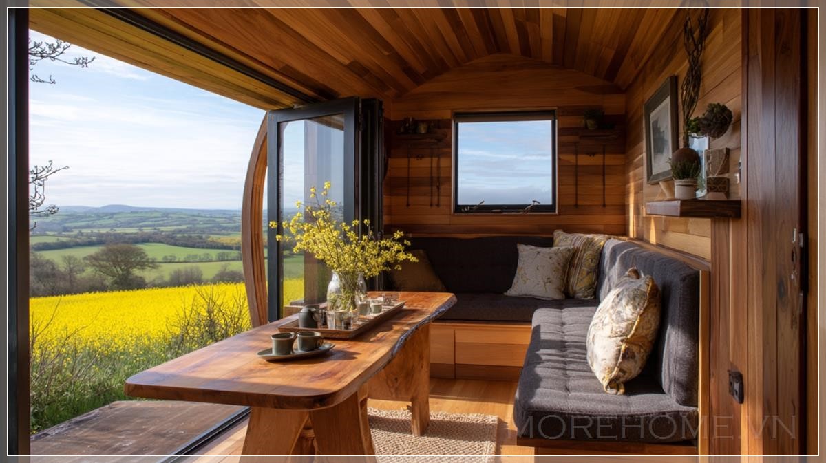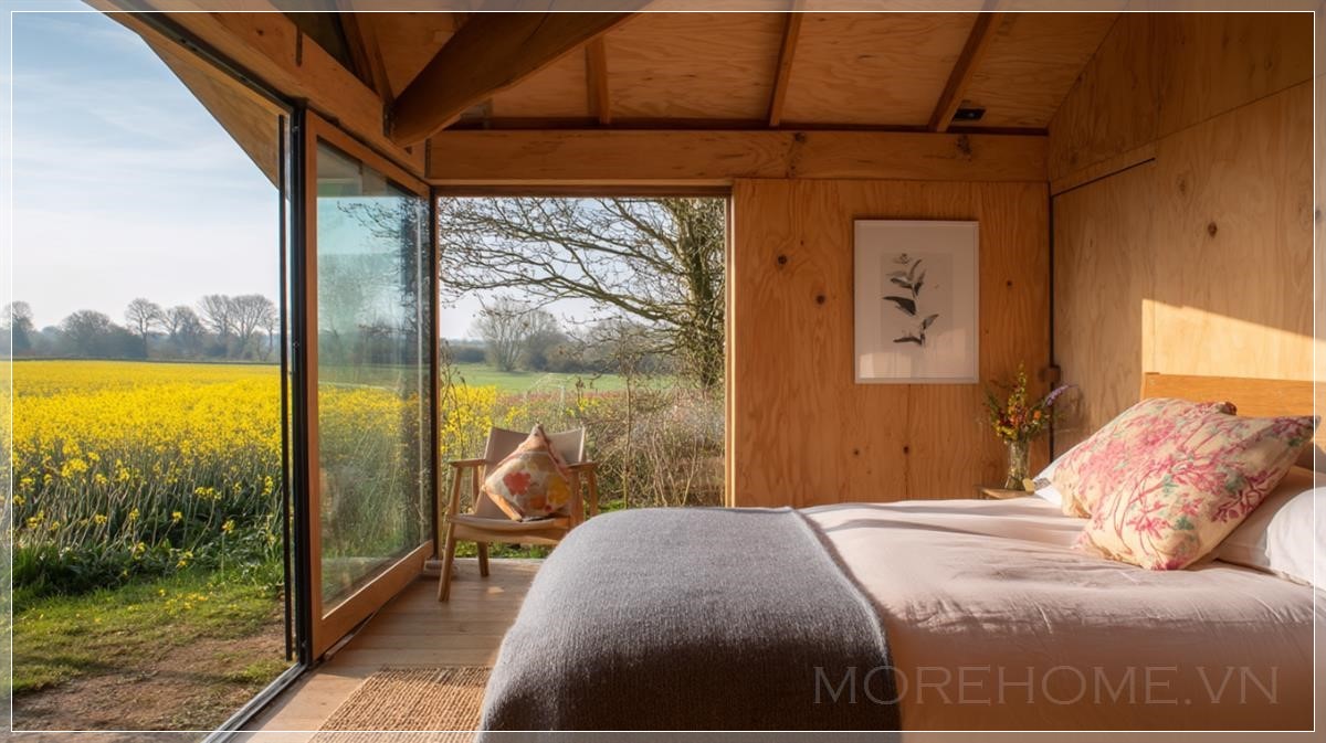 Ảnh chụp nội thất độ phân giải cao của một ngôi nhà gỗ hiện đại nhưng ấm cúng ở vùng nông thôn Anh (Surrey), với cánh đồng hoa cải dầu, vào mùa xuân, phong cách nhiếp ảnh. Liên hệ: https://zalo.me/morehomevietnam