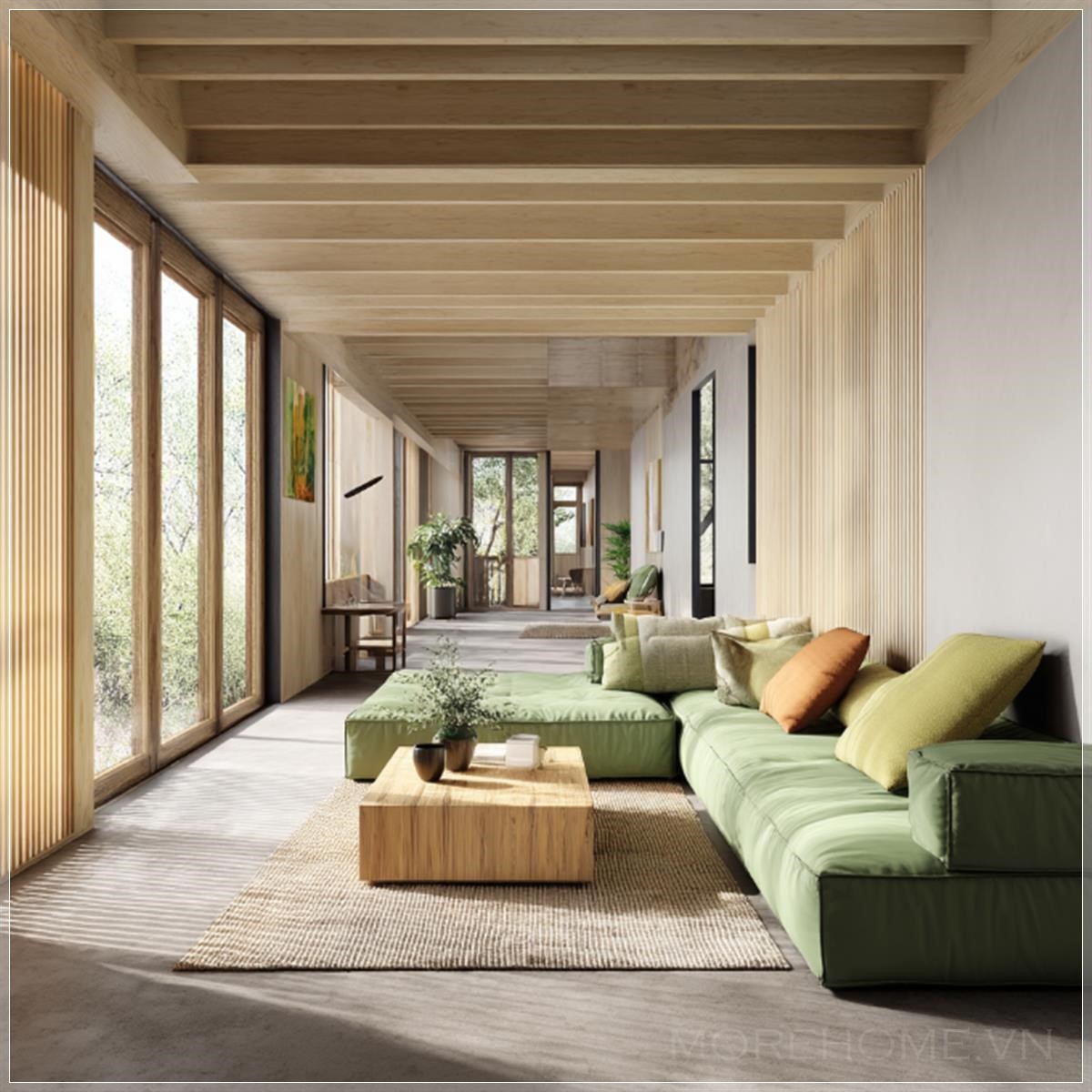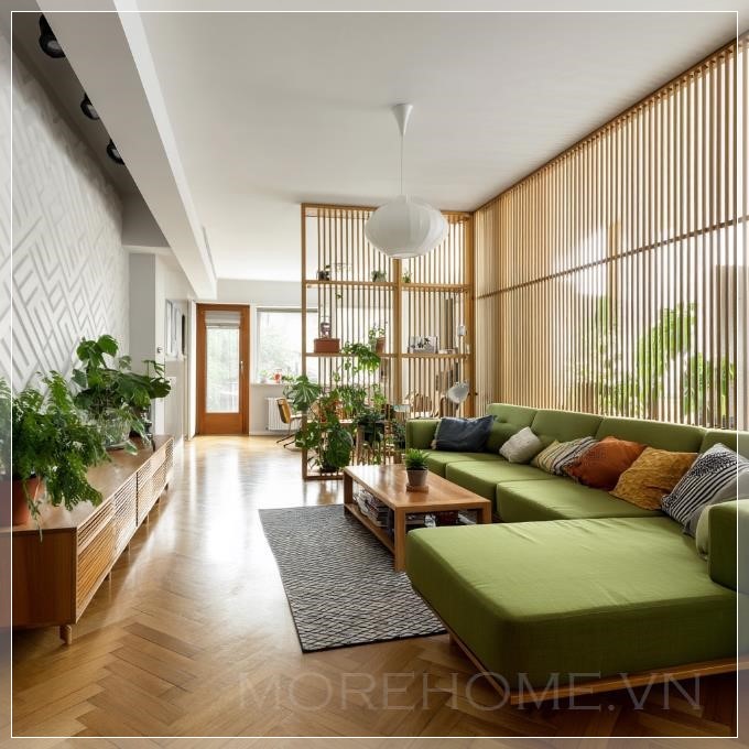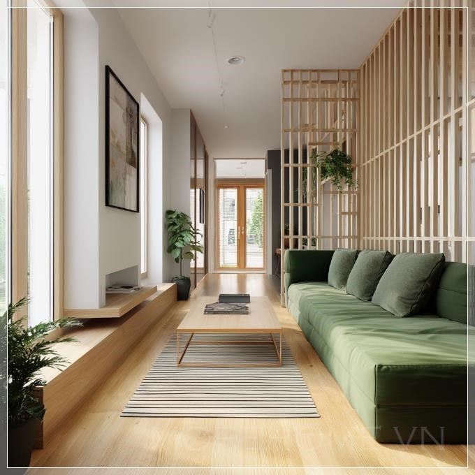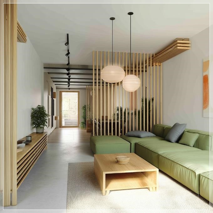 Phòng khách rộng 4 mét x 9 mét, với một lối đi ở phía bên phải, ghế sofa mô-đun màu xanh lá cây bên trái, bàn cà phê bằng gỗ, vách ngăn gỗ dạng thanh chia phòng khách với cửa trước ở cuối phòng, thiết kế Scandinavian.