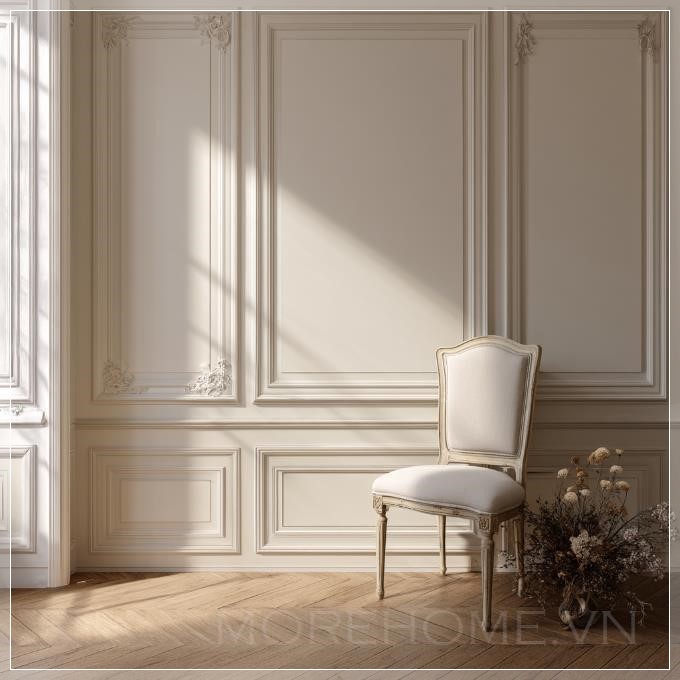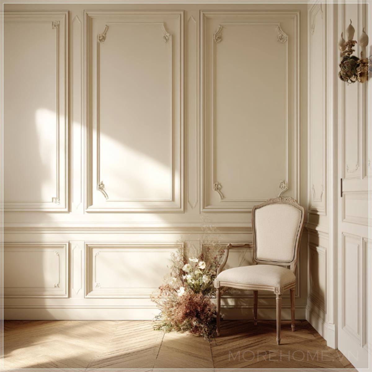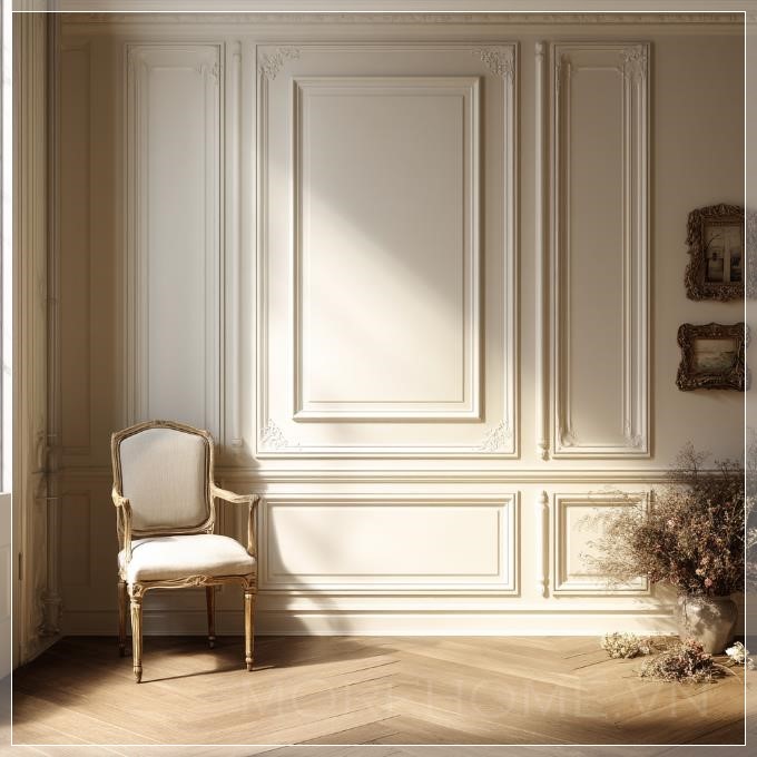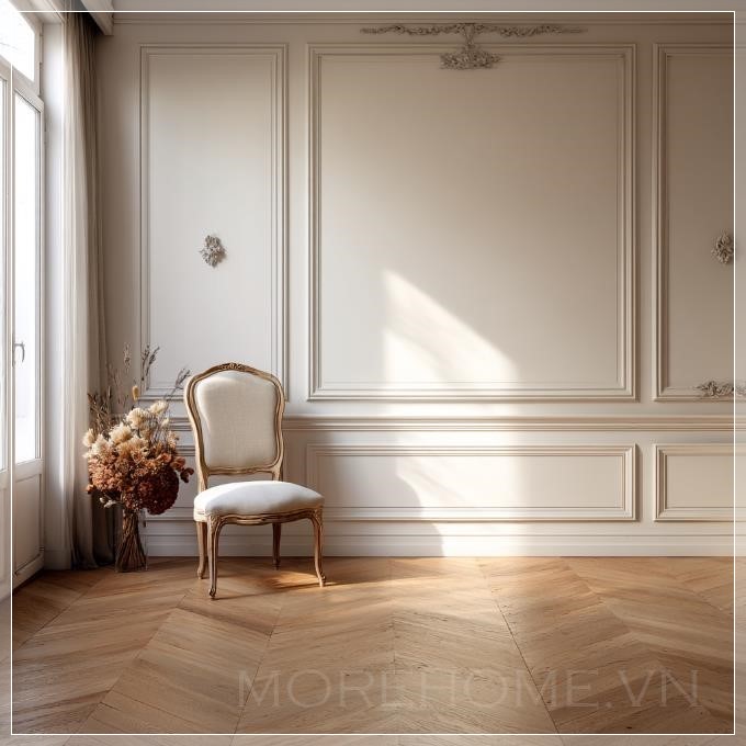 Một góc nhìn hoàn hảo của bức tường căn hộ Paris cổ điển với các chi tiết panel tinh tế, màu sắc trung tính nhẹ nhàng như trắng trứng và ngà ấm. Sàn gỗ herringbone mang đến vẻ đẹp vượt thời gian, và bức tường hoàn toàn trống trải, không có khung ảnh hay tác phẩm nghệ thuật nào. Bên cạnh là chiếc ghế Louis XVI cổ điển với chất liệu bọc vải nhạt, đặt một cách duyên dáng, và một bó hoa khô nằm trên sàn gần đó. Ánh sáng tự nhiên nhẹ nhàng chiếu vào từ bên phải, tạo ra những bóng đổ dịu dàng sang trái. Không gian mang lại cảm giác lãng mạn, yên tĩnh và sang trọng, hoàn hảo để đặt khung ảnh và tác phẩm nghệ thuật của riêng bạn. 5 từ khóa mô tả: parisian, elegant, timeless, romantic, refined, DSLR, 50mm lens, natural light, cinematic, high-resolution film.