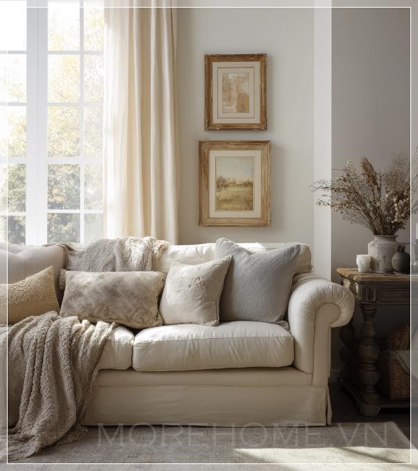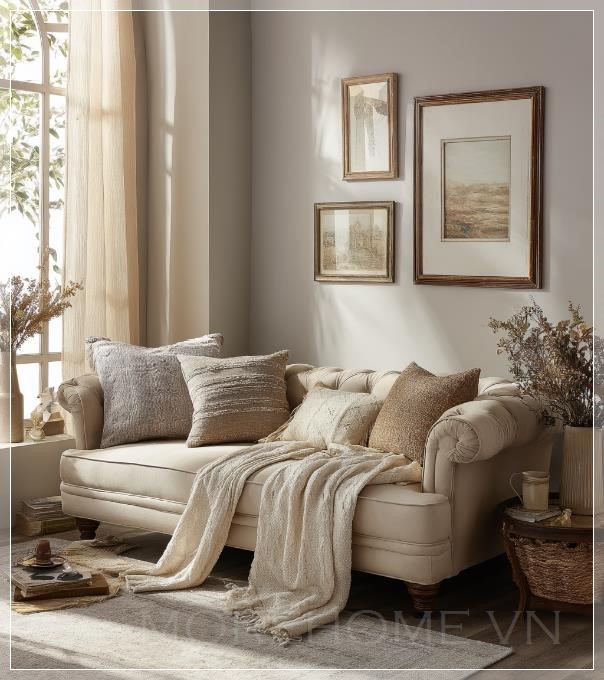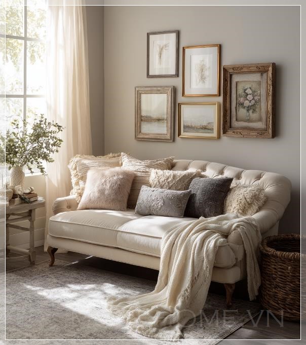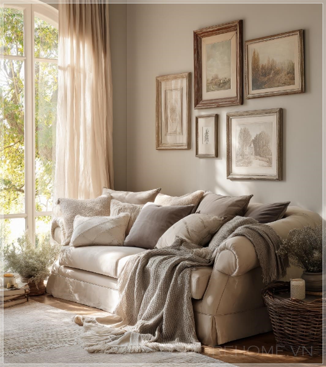 Phòng khách với chiếc sofa cổ điển, phủ những chiếc chăn mềm mại và xung quanh là những chiếc gối trang trí mang cảm hứng vintage. Những bức tranh được treo trên tường, tôn lên bảng màu trung tính như be, kem và xám nhạt. Một cửa sổ bên cạnh mở ra ánh sáng mặt trời chiếu qua những chiếc rèm mỏng, tạo ra những bóng mờ nhẹ nhàng trên bề mặt. Cảnh vật này tạo ra một không gian ấm cúng, lý tưởng cho sự thư giãn hoặc các cuộc gặp gỡ xã hội.