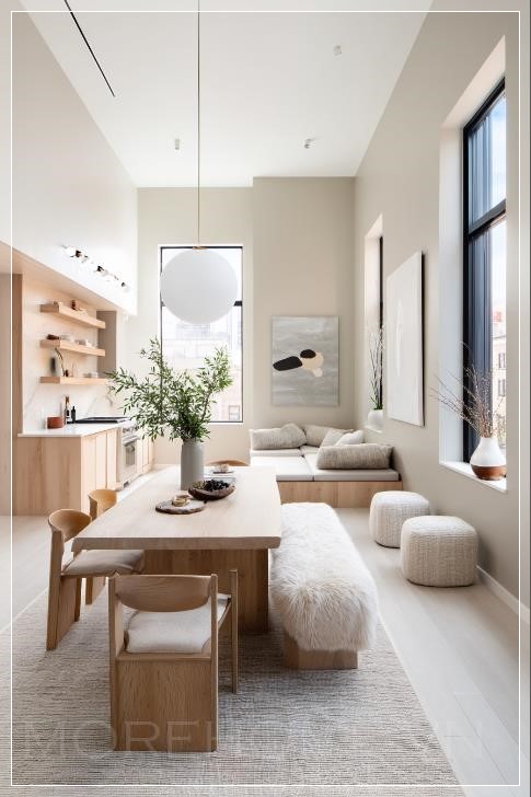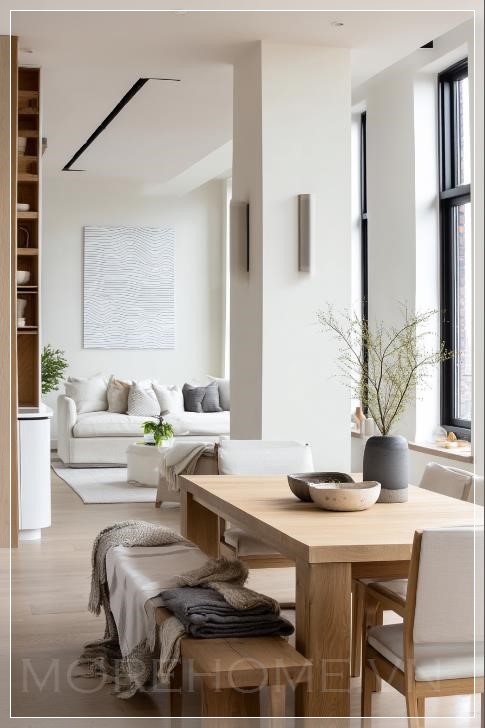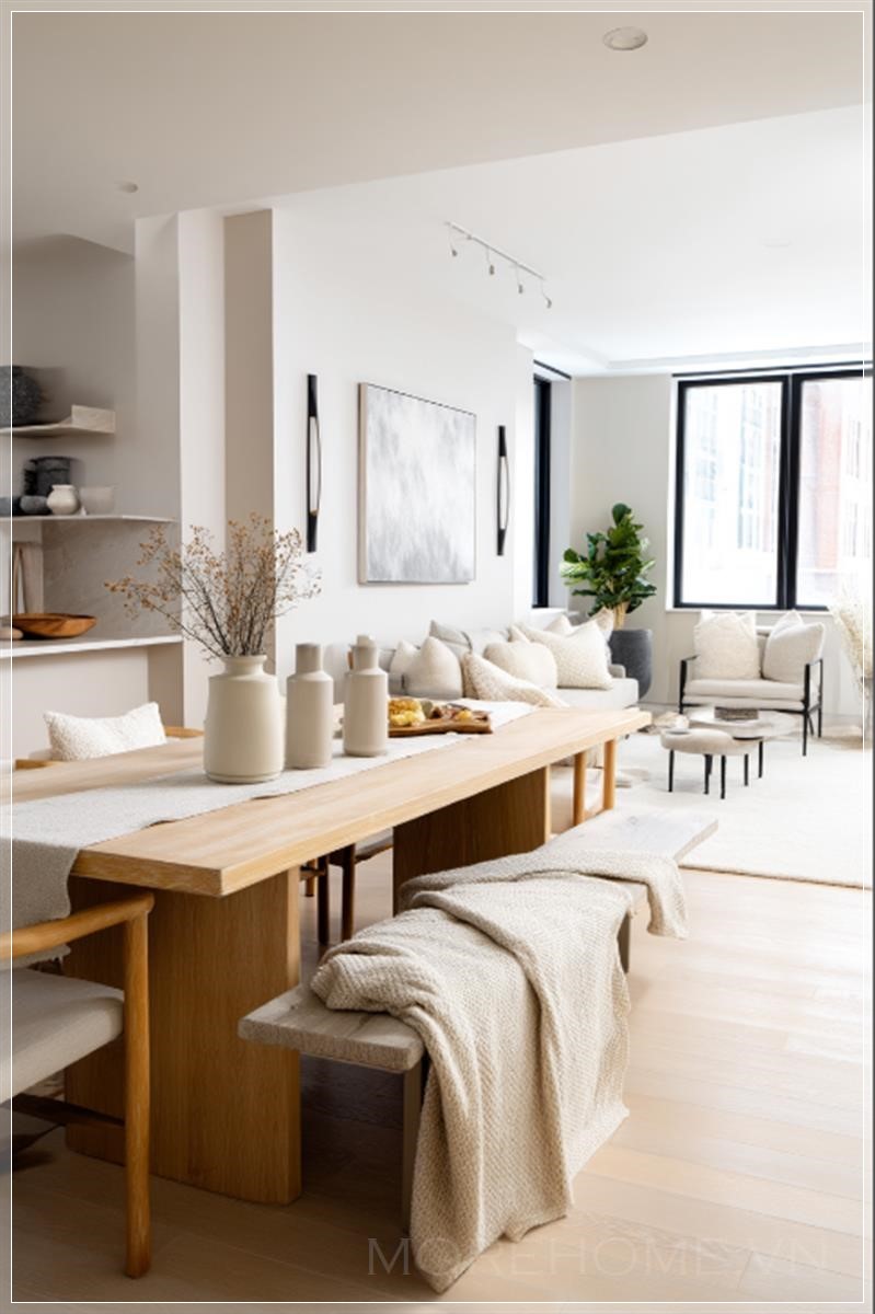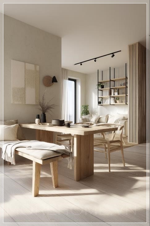 Không gian sống hiện đại tối giản: bày trí mở với tường màu ngà và xám nhạt, nội thất tinh tế làm từ vật liệu tự nhiên như bàn gỗ sồi sáng với những chiếc ghế đơn giản. Điểm nhấn: gối bọc vải lanh nhẹ, chăn len mềm mại, tranh trừu tượng trên tường và những chậu cây nhỏ trong các chậu trang trí sang trọng. Sử dụng vách ngăn gỗ nhẹ hoặc kệ mở để phân chia khu vực bếp và phòng khách. Ánh sáng: cửa sổ lớn để ánh sáng tự nhiên, đèn trần với các đường nét thẳng, đèn tường tối giản. Kết cấu: bề mặt mịn màng, vải mềm mại. 8K photorealism, bóng đổ tự nhiên, tập trung vào kết cấu vật liệu (vân gỗ, dệt vải). Tránh: trang trí lộn xộn, logo thương hiệu.