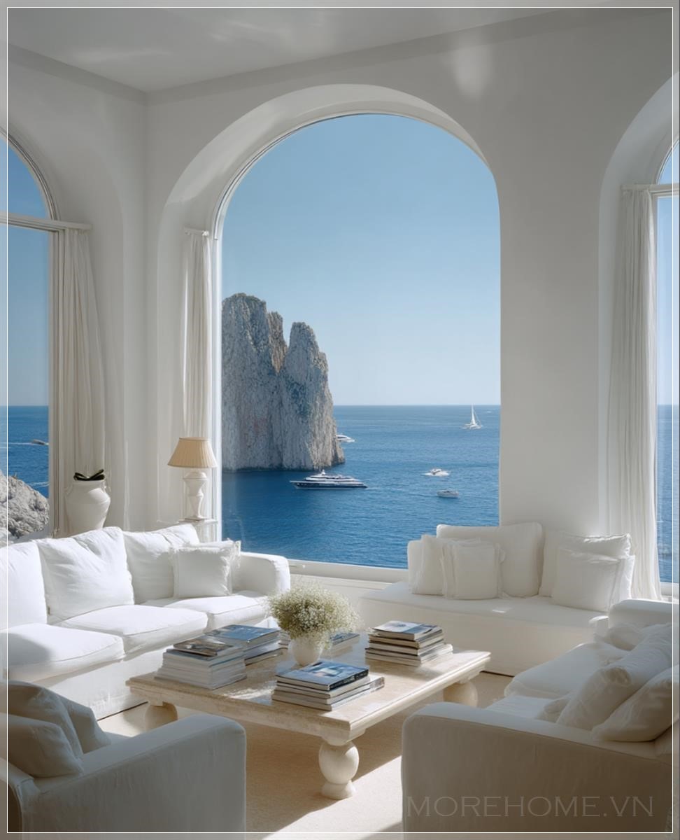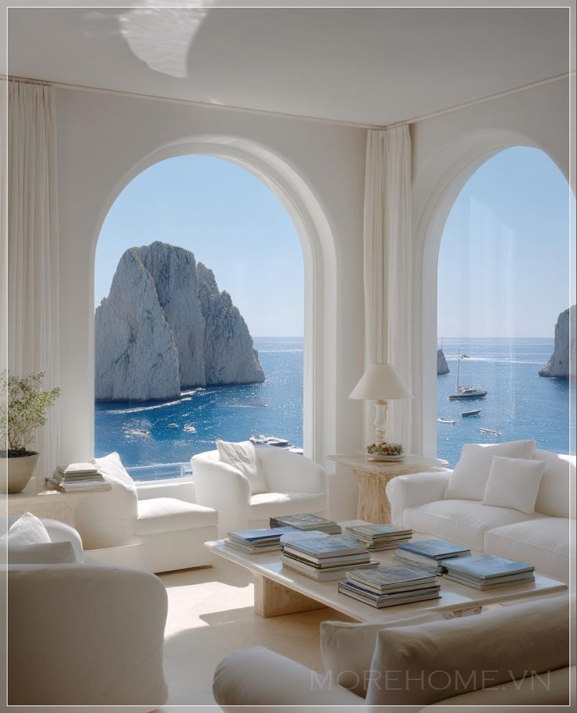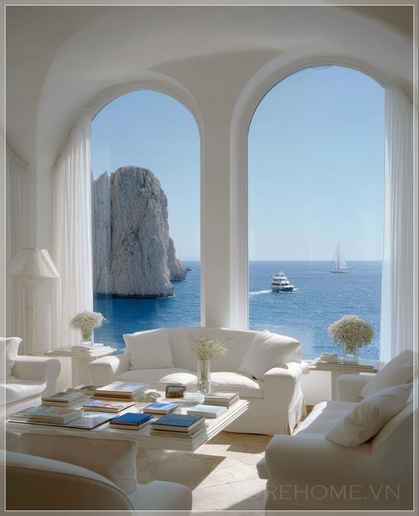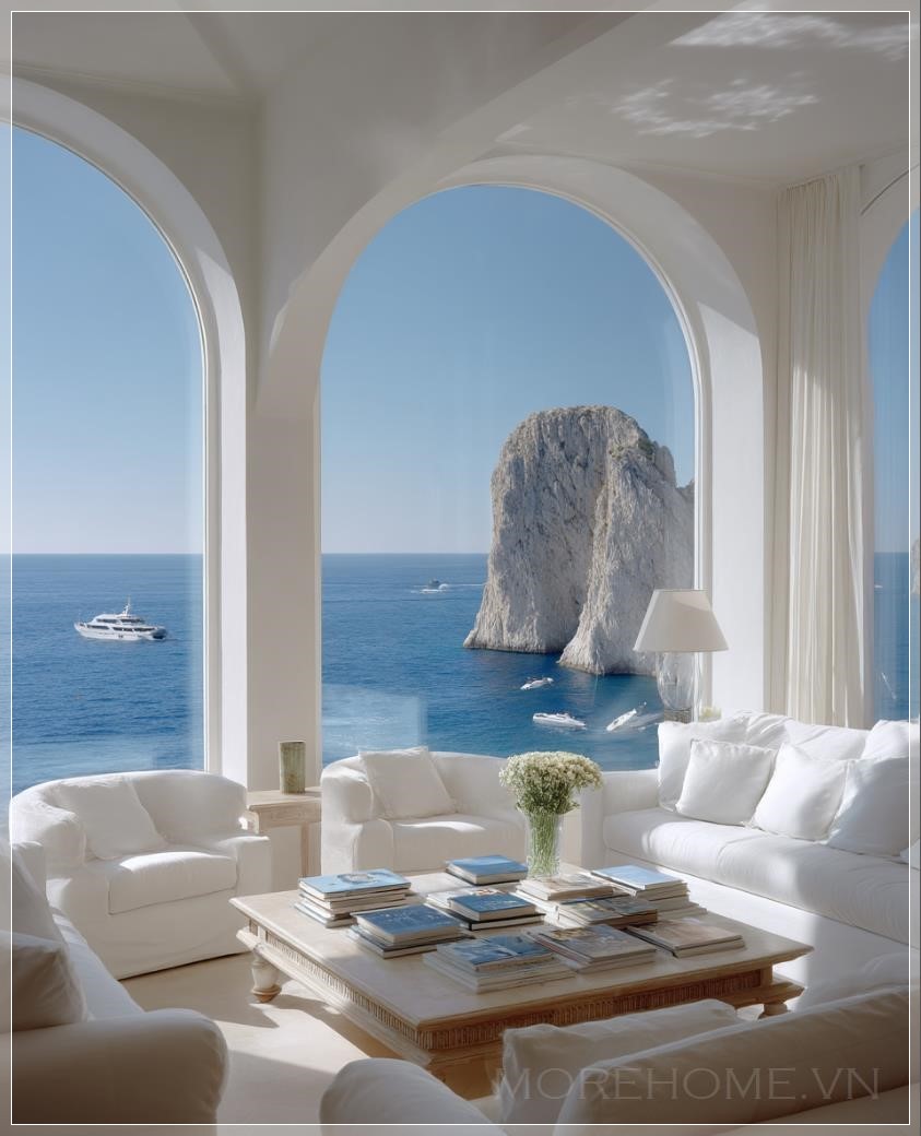 Trong một không gian đẳng cấp và thanh bình, phòng khách rộng lớn mở ra một khung cảnh tuyệt đẹp của biển cả. Những cửa sổ lớn bao trùm không gian, cho phép ánh sáng tự nhiên chiếu rọi vào bên trong, tạo nên một bầu không khí thư giãn và sang trọng. Bên ngoài, bức tranh biển xanh mướt hiện lên sống động, những chiếc thuyền đang lướt sóng trên đại dương, mang lại cảm giác như bạn đang hòa mình vào thiên nhiên tuyệt vời của đảo Capri, Italy.