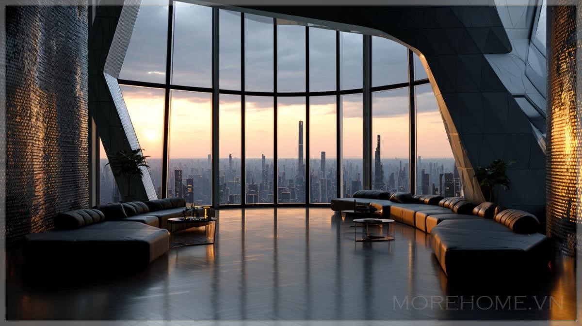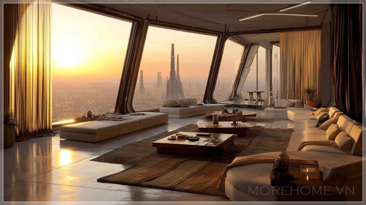 Không gian mở rộng như vô tận, nơi những bức tường kính cao chạm trần phô bày toàn cảnh thành phố tương lai xa tít tắp phía chân trời. Ánh sáng vàng cam của hoàng hôn tràn ngập căn phòng, như lớp mật ong lỏng lẽo thấm vào từng thớ vải ghế sofa, len lỏi qua những đường cong kim loại của bàn thấp hình học, và phản chiếu nhẹ nhàng trên bề mặt sàn nhẵn mịn màu bê tông xám tro.