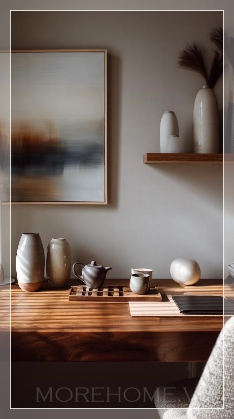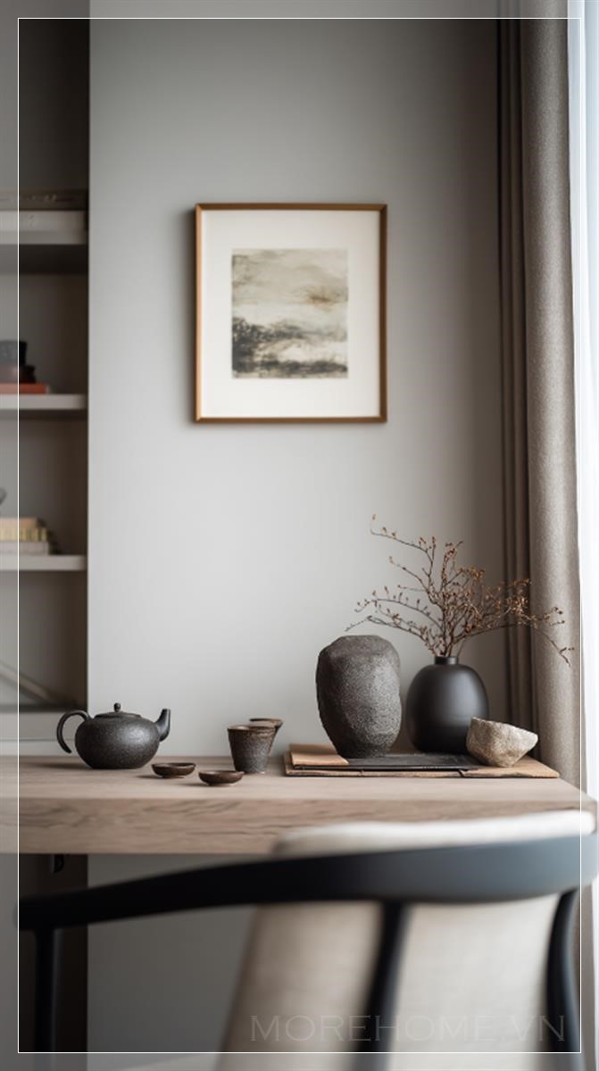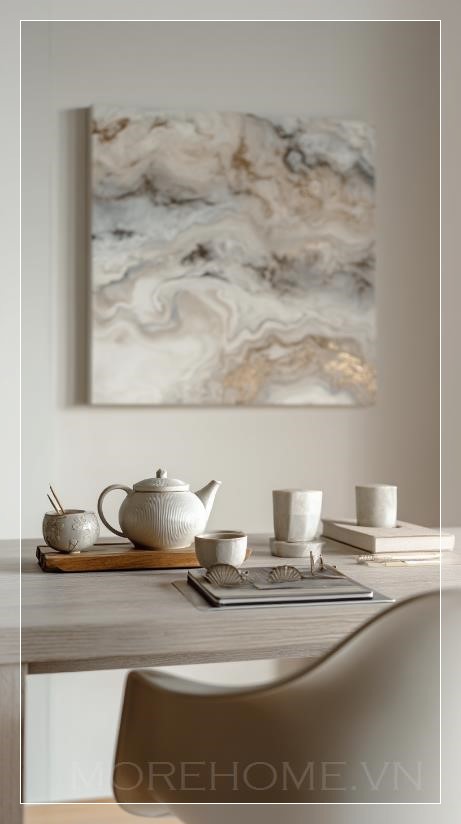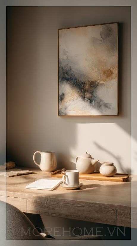Trong thế giới ngày nay, không gian làm việc không chỉ còn là nơi để hoàn thành công việc mà còn là nơi thể hiện cá tính và sở thích của mỗi người. Một không gian làm việc với thiết kế tinh tế, kết hợp giữa nghệ thuật và thẩm mỹ, đặc biệt là sự hiện diện của những tác phẩm nghệ thuật trừu tượng, có thể mang lại cảm hứng sáng tạo và sự thư giãn cho người sử dụng. Đặc biệt, khi sử dụng các yếu tố thiết kế như một chiếc bàn làm việc thấp, bộ ấm trà gốm sứ, cùng với một bức tranh trừu tượng, không gian làm việc sẽ trở nên thanh bình và đầy nghệ thuật.