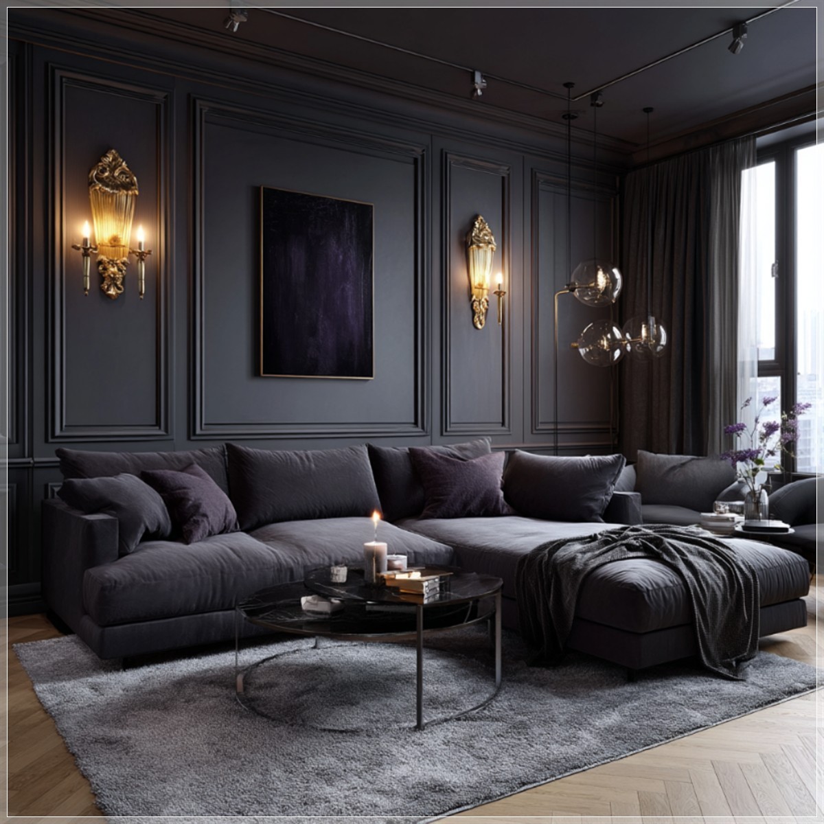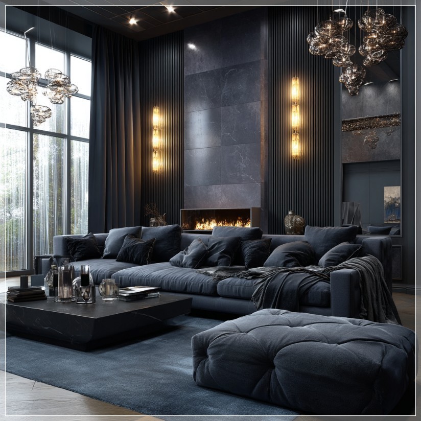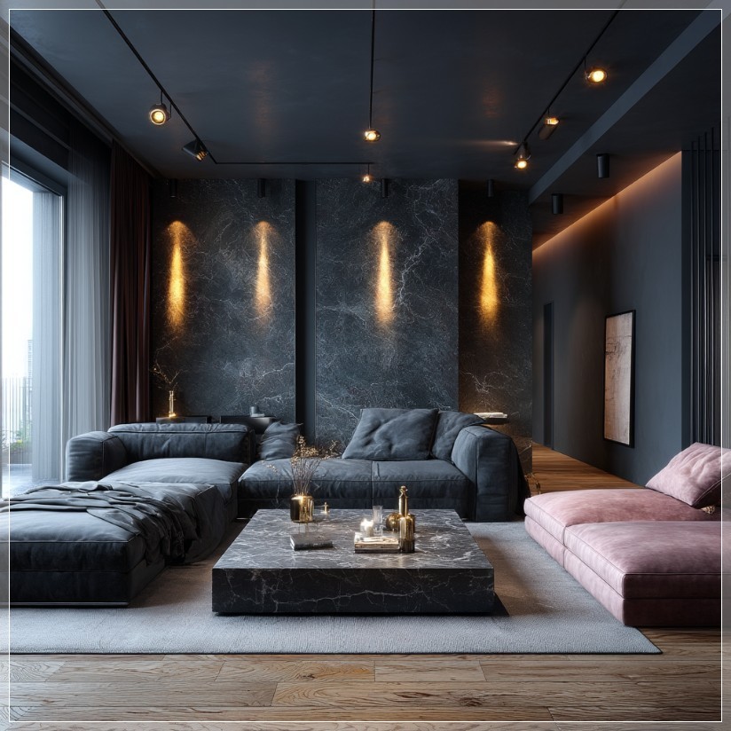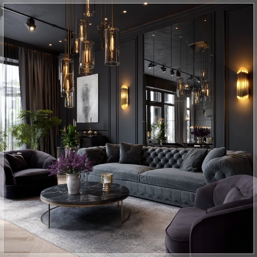 Bức tranh nội thất hiện lên qua prompt MidJourney là một không gian mang đậm cá tính với gam màu tối làm chủ đạo. Không gian ấy không hề u ám hay lạnh lẽo – ngược lại, nó gợi nên cảm giác ấm áp và gần gũi nhờ những điểm nhấn ánh sáng vàng nhẹ từ các đèn gắn tường. Mỗi chiếc đèn không chỉ đóng vai trò chiếu sáng mà còn là một phần của bố cục thị giác, định hình đường nét mềm mại và tạo chiều sâu cho không gian. Ánh sáng vàng len lỏi qua các góc tường, chạm vào bề mặt vải nỉ của sofa, tạo nên những vệt phản chiếu nhẹ nhàng, như thể không gian đang thở.