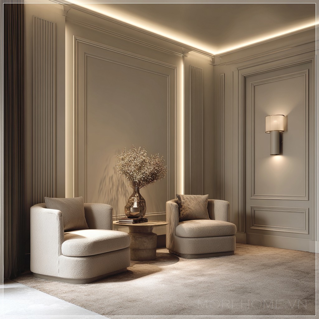 Điểm nổi bật đầu tiên của thiết kế nằm ở cách xử lý mảng tường. Các bức tường được phủ hoàn toàn bằng hệ phào chỉ bao gồm cả phào chân và phào trần – tạo nên khung nền cổ điển nhưng không quá trang trọng. Sự kết hợp này gợi liên tưởng đến không gian Châu Âu cổ, nhưng lại được tiết chế bằng màu sắc hiện đại và hệ ánh sáng tinh chỉnh. Tông màu kem cát chủ đạo – từ tường, sàn cho đến nội thất – được xử lý đồng nhất, khiến tổng thể trở nên nhẹ nhàng, thanh thoát và đặc biệt phù hợp với ánh sáng tự nhiên hoặc ánh sáng dịu nhẹ vào buổi chiều.