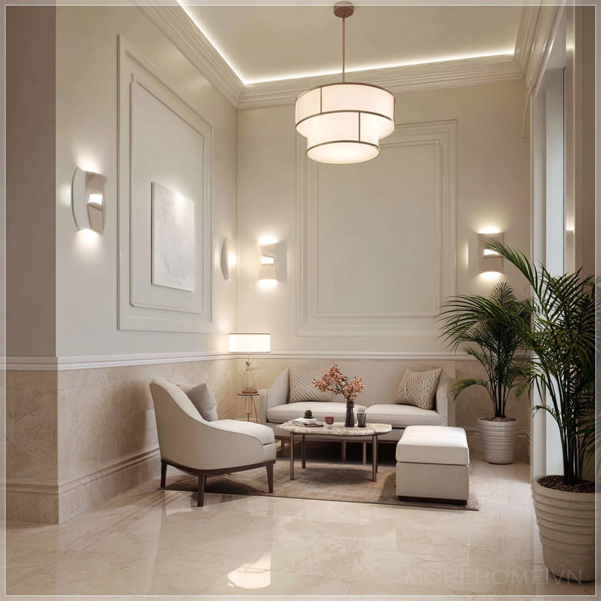 Thiết kế tiền sảnh theo phong cách editorial với những chi tiết phào chỉ và ánh sáng gián tiếp tinh tế mang đến một cảm nhận rất riêng: đó là sự yên tĩnh, sang trọng và đầy gợi mở. Không gian không cần nhiều màu sắc hay vật liệu cầu kỳ, chỉ cần bố cục chuẩn, ánh sáng khéo léo và một bảng màu trang nhã là đủ để để lại ấn tượng lâu dài. Với một thiết kế như vậy, việc bước vào không gian trở thành trải nghiệm nhẹ nhàng và đầy cảm xúc – điều mà bất kỳ công trình nào cũng mong muốn đạt được.