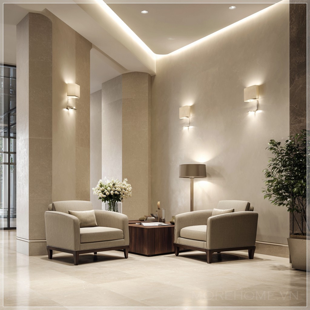 Không gian tiền sảnh từ lâu đã vượt ra khỏi vai trò thuần túy là nơi chờ hay đón tiếp. Trong các công trình hiện đại, đặc biệt là khách sạn, văn phòng cao cấp hay khu căn hộ dịch vụ, tiền sảnh đóng vai trò thiết lập ấn tượng đầu tiên – một cách tinh tế để định hình cảm nhận về tổng thể thiết kế bên trong. Bài trí theo phong cách editorial với tông màu cát – kem nhẹ, kết hợp phào chỉ tường và ánh sáng LED âm ở chân tường, không gian này đem lại cảm giác thanh lịch nhưng không cầu kỳ, ấm áp mà vẫn đủ sự sang trọng cần thiết.