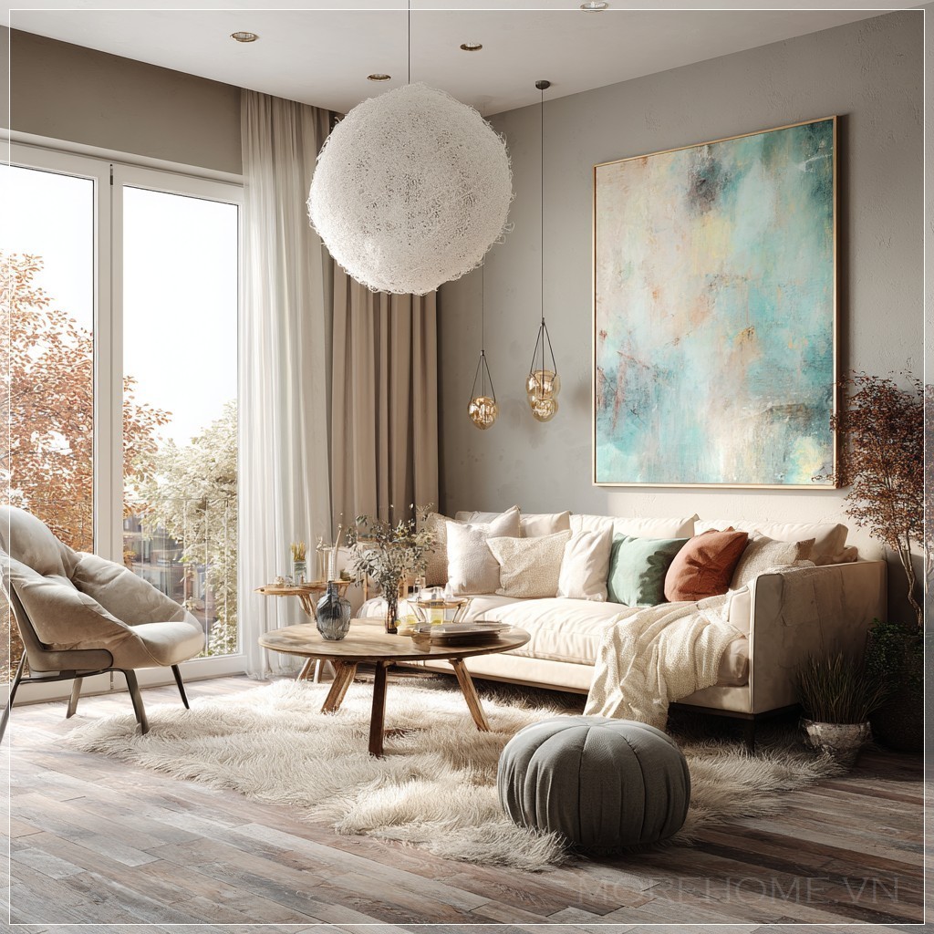 Không khí mùa xuân được đưa vào không gian một cách tinh tế qua ánh sáng tự nhiên và cách sắp xếp nội thất gọn gàng. Cửa kính lớn đón nắng giúp ánh sáng tràn ngập căn phòng, phản chiếu nhẹ nhàng trên bề mặt sàn gỗ và tường trắng. Những chiếc rèm mỏng màu kem hay ánh be không chỉ tạo hiệu ứng thẩm mỹ mà còn góp phần điều tiết ánh sáng, làm dịu mắt trong những ngày nắng gắt. Ngoài ra, cây xanh điểm xuyết nơi góc phòng như lời nhắc khẽ về sự hồi sinh, sinh khí và nhịp sống chậm rãi của mùa xuân.